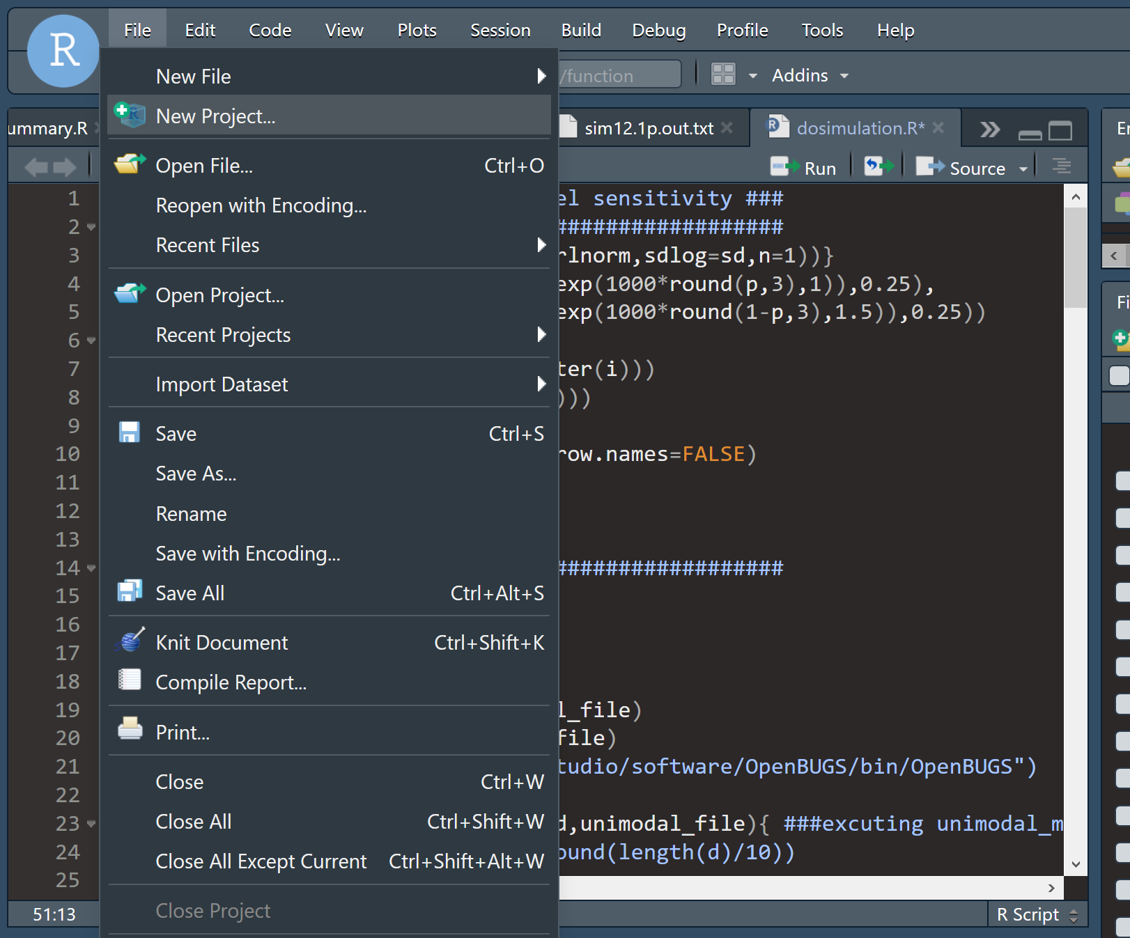 流程a:file -> New Project -> New Directory -> New Project -> Directory name (建议底下两个全勾上,第一个帮你创建.git文件夹,第二个是非常好用的包管理工具) -> Create Project 流程b:file -> New Project -> Existing Directory -> 指定文件夹 -> Create Project (这方法属实不推荐,除了建了一个.Rproj等于啥也没干,需要自己初始化git,我还不如用第一种方法然后把文件全mv过来) 流程c:file -> New Project -> Version Control -> Git (svn 没用过不知道) -> Create Project (同样需要指定文件夹,还需要指定git clone的地址,用于已有git的情形) 接下来,可以打开.gitignore(如果有的话),把不想上传的文件和文件夹给ignore掉,比如数据文件和中间文件。