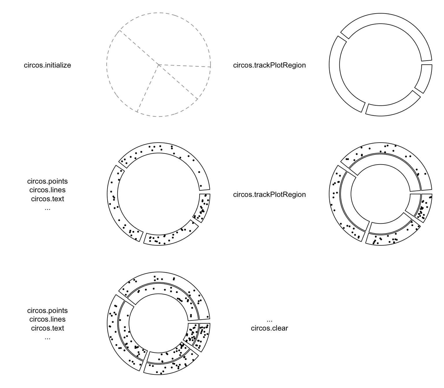 由于图形大多由点、线、多边形等简单图形组成,circlize实现了在圆形作图区域添加图形的低级绘图函数,通过低级绘图函数的不同组合,可以轻松生成更复杂的图形。这一原则确保了各种类型的高级图形不会受软件包本身的通用性限制,并且可以在此基础上构建针对特定兴趣的高级包。