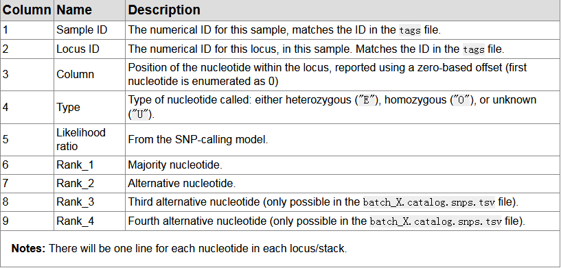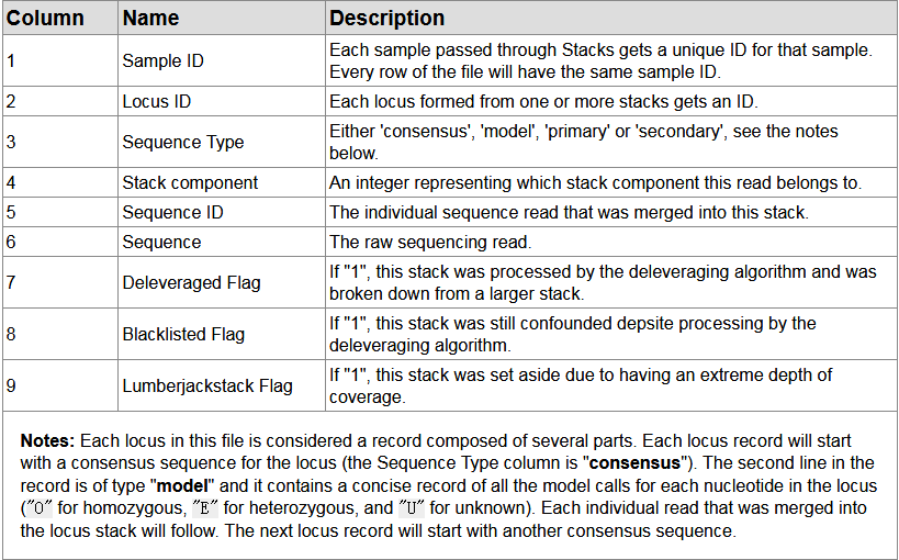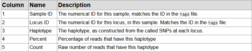 tags.tsv用于存入assembled loci序列信息,各列解释: